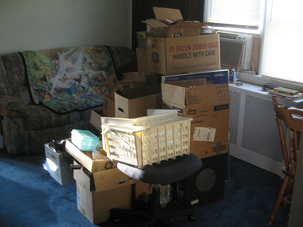 Not much progress on the apartment, unless you count buying an antiqued tin sign that reads, “Coffee! You Can Sleep When You’re Dead”, and nailing that to the kitchen wall. After I asked whether a door that fits the bedroom doorway might be hanging around in the basement, or in the shed, the landlady decided that she was going to get someone professional up here to custom install a new one; it turns out there were sliding doors on the bedroom previously, but they were cheap and kept breaking, so one tenant finally asked that they just be taken out. No firm word on when that work will start.  In the meantime, I might be able to put away a few more things today, if I can get through the maintenance-level tasks first. The birds are overdue to be cleaned, I need to vacuum, put the laundry away, clean the bathroom sink, water the plants. Etcetera.